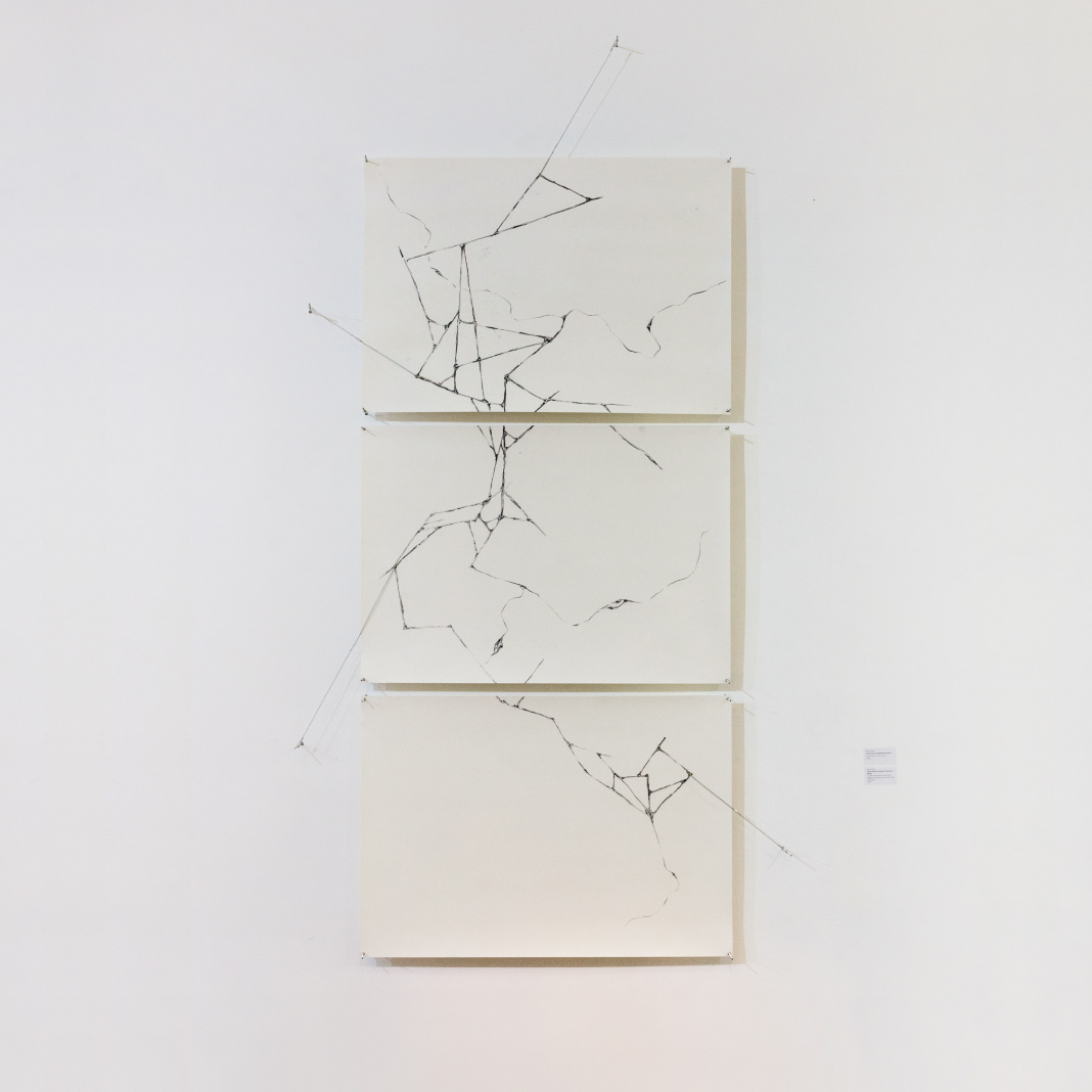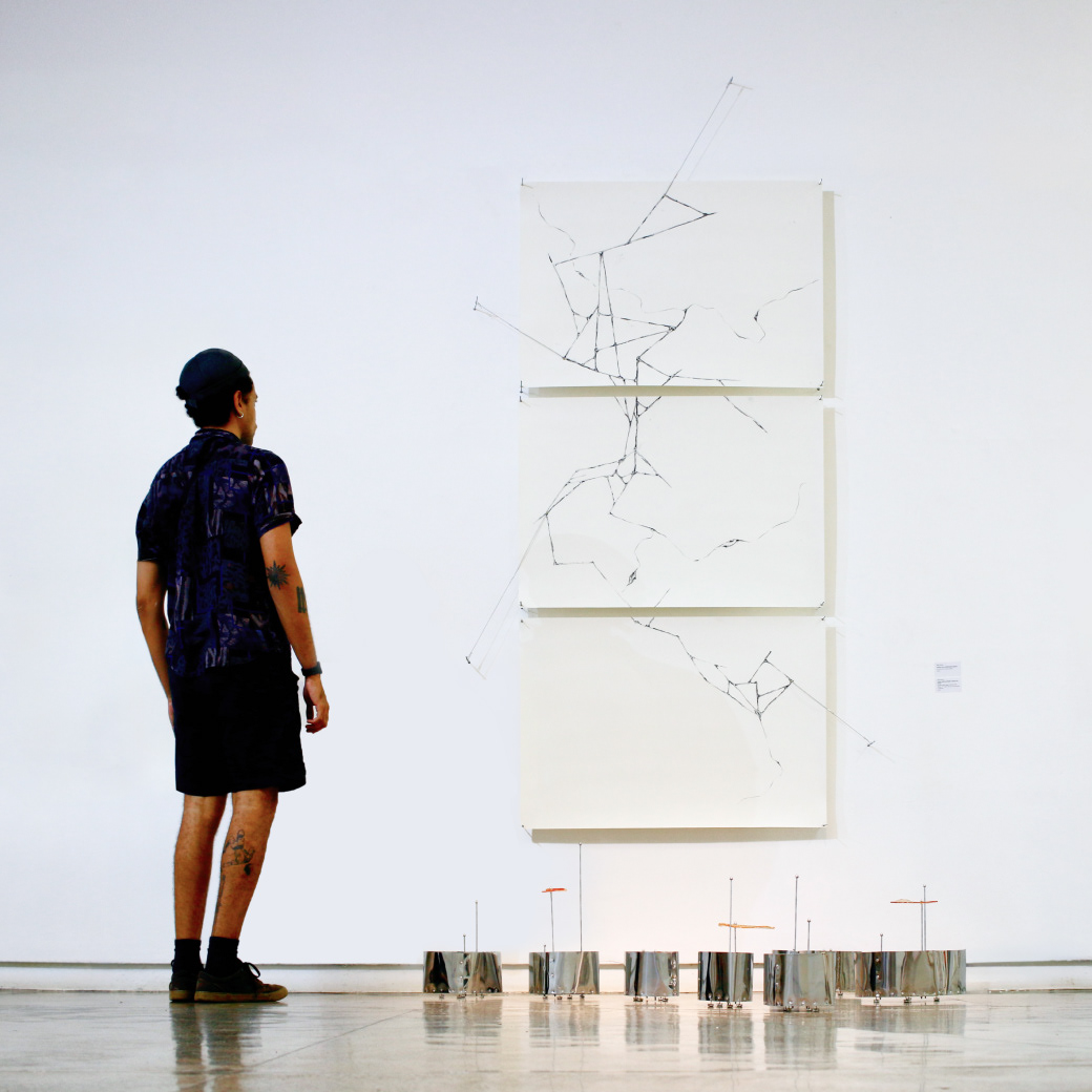Carvão sobre papel Hahnemühle 180g, com cabos de aço tensionando o suporte e parafusos para telha de amianto.